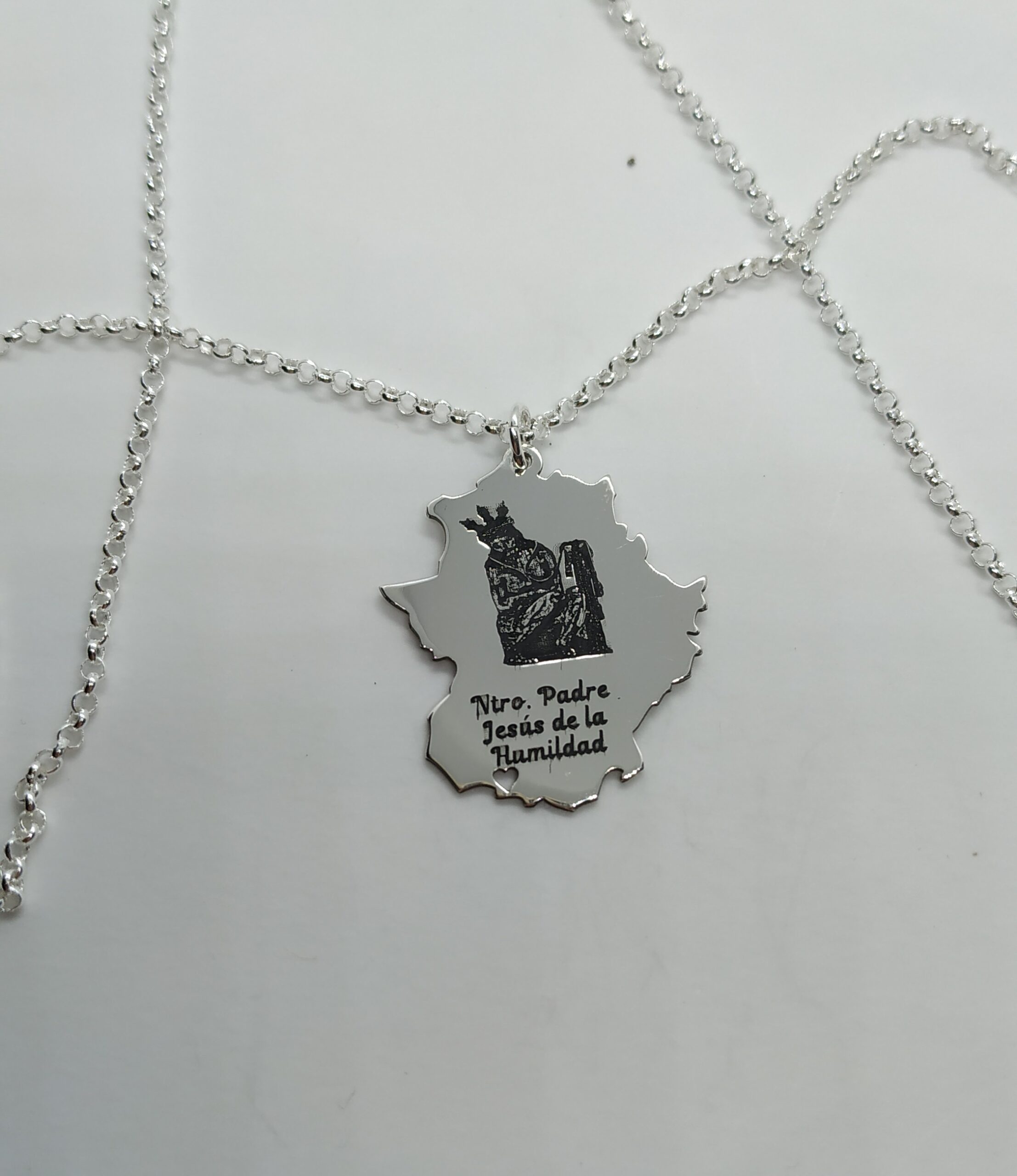 • Colgante realizado en plata con la imagen del Señor de la Humildad de Higuera la Real sobre la silueta de Extremadura.