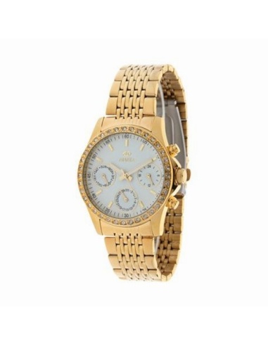 Reloj Marea para mujer modelo B41137/3Se trata de un reloj analógico y multifunción con caja de metal y correa de acero inoxidable, ambas con baño dorado. Tiene función de calendario y es sumergible a 5ATM. Funciona con pila y tiene una garantía de 2 años.