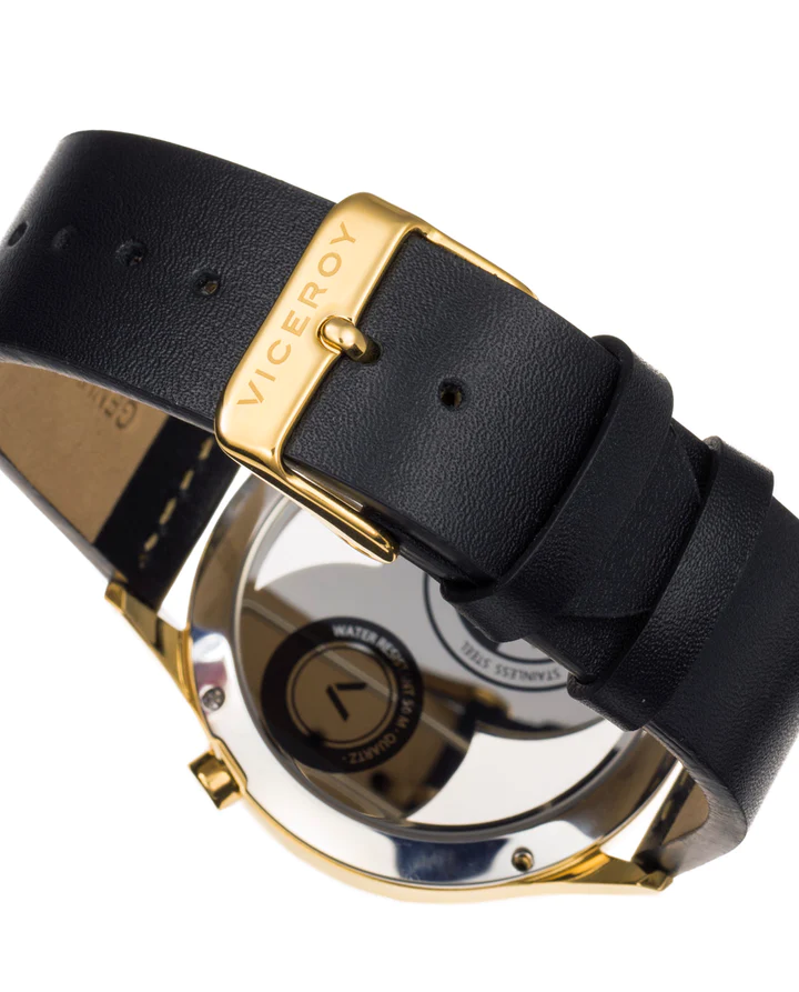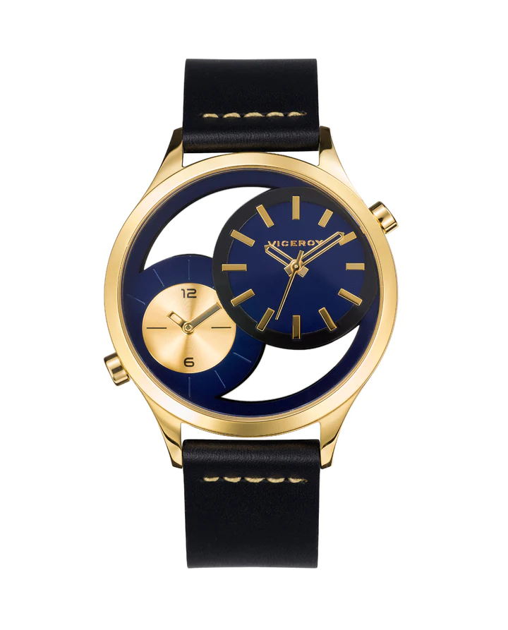 Reloj de Hombre Viceroy Beat tres agujas con la caja de acero con IP dorado, esfera transparente y azul con doble horario y correa de piel negra
